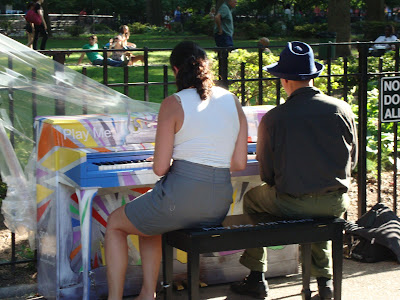 Well I got linked on curbed today for one of my Pee Phone posts..They were saying how the Play Me pianos that have popped up everywhere might be kinda gross in Tompkins Square Park judging by the gross yet undeniably erotic pay phone by Ray's..Well today I sunbathed in Tompkins and then went to check out the piano that is now there. My friends were there from the great band The Bill Murray Experience..and Blind Boy Paxton went nuts on the piano while Horatio played guitar and Jessy Carolina sang..so that was pretty damn awesome. However I did hear a lot of Piano Man by Billy Joel being played..Can't they at least play Vienna? Christ on a fucking Crutch!